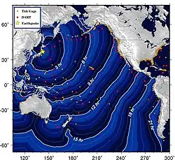 Uma elevação de 6 a 8 metros ao longo de 180 quilômetros de largura no fundo do mar a 60 quilômetros ao largo da costa leste de Tōhoku[84] resultou em um grande tsunami, que trouxe destruição ao longo da costa do Pacífico das ilhas do norte do Japão. Milhares de vidas foram perdidas e cidades inteiras foram devastadas. O tsunami se propagou por toda a região do Oceano Pacífico atingindo, do Alasca ao Chile. Avisos foram emitidos e evacuações foram realizadas em muitos países que fazem fronteira com o Pacífico. Embora o tsunami tenha afetado muitos desses lugares, as alturas das ondas foram menores.[85][86][87] A costa do Pacífico do Chile, uma das mais distantes do Japão em cerca de 17 mil quilômetros de distância, foi atingida por ondas 2 metros de altura,[88][89][90] em comparação com uma altura de onda estimada de 38,9 metros na cidade de Miyako, Japão.[91]