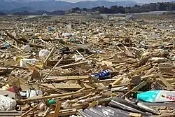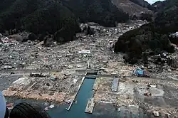 Como no Sismo do Oceano Índico de 2004 e no Ciclone Nargis, o dano da afluência de água, embora muito mais localizado, pode ser muito mais letal e destrutivo do que o terremoto em si. Há relatos de "cidades inteiras destruídas" nas áreas atingidas pelo tsunâmi no Japão, incluindo 9 500 desaparecidos em Minamisanriku;[104] Kuji e Ofunato que foram "varridas...não deixando nenhum vestígio de que uma cidade estava lá".[105]