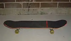 •Shape: É a base do Skate, geralmente feito de madeira e pode ter diferentes tamanhos e formatos, o que dará a característica de longboard, skate oldschool etc[7]. Os shapes comumente são compostos por várias e finas camadas de madeira que foram prensadas juntamente com resina epoxi para aumentar a resistência da madeira, mas podem ser de outros materiais.