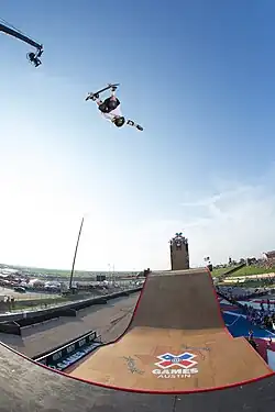 A modalidade vertical é praticada em uma pista com curvas (transições), com 3,40 m ou mais de altura, três metros de raio e quarenta centímetros de verticalização, geralmente possuem extensões. A pista, que apresenta a forma de U, é chamada de half-pipe e pode ser feita de madeira ou concreto[7]. O conceituado skatista Tony Hawk ficou famoso por suas grandes habilidades nos half-pipes. Tornou-se o que é graças à sua mãe, que comprava batatas fritas para ele sobreviver nos treinos da sua escolinha de skate, onde começou a praticar o esporte aos 3 anos de idade. Aos 6 anos, já tinha o patrocínio da Volcom, Vans, Element,entre outras. Nessa idade, já fazia flips e grinds pela cidade, onde se machucava muito. Um desses machucados, consequente de um flip "mal chutado", afastou-o do esporte durante um ano, pois ele quebrou sua perna direita e ralou todo o joelho esquerdo, o que demorou muito para curar.