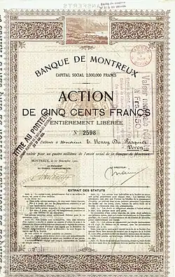 Ações do Banque de Montreux, emitidas em 20 de novembro de 1900. Sociedades anônimas eram comuns na Suíça nessa época