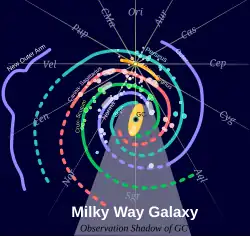 - ↑ Reid, M.J. (1993). «The distance to the center of the Galaxy». Annual Review of Astronomy and Astrophysics. 31: 345–372. Bibcode:1993ARA&A..31..345R. doi:10.1146/annurev.aa.31.090193.002021