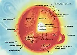 | Densidade por região[9] | Núcleo: 1,5 ×10 5 kg/m3 Base da fotosfera: 2×10−4 kg/m3 Base da cromosfera: 5×10−6 kg/m3
