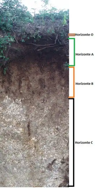 • A - Horizonte superficial, com bastante interferência do clima e da biomassa. É o horizonte de maior mistura mineral com húmus;