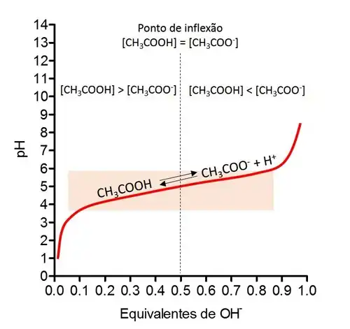 O ácido fraco possui certa afinidade pelo seu íon H+ (medida pelo pKa do ácido), e portanto, em solução, está somente parcialmente dissociado. Já o ácido forte ou base forte possuem uma afinidade fraca por seus íons H+ ou OH-, respectivamente, estando quase completamente dissociados em solução. A constante de dissociação do ácido acético é representada por: Ka = [CH3COO-] [H+] / [CH3COOH]. No exemplo da figura, conforme o NaOH vai sendo adicionado, seu íon OH- sequestra os prótons H+ do ácido, deslocando a reação de dissociação do ácido acético para a direita, ou seja, no sentido da reposição do próton. Dessa forma, as concentrações permanecem em uma relação que mantenha a equação da constante de dissociação com suas proporções originais. No ponto de inflexão da curva, onde 0,5 equivalentes de OH- foram adicionados, temos metade do ácido na sua forma dissociada e metade na forma não dissociada, igualando as concentrações do aceptor de prótons [CH3COO-] e do doador de prótons [CH3COOH]. Este é o ponto em que o pH é exatamente igual ao pKa (4,76). Conforme mais OH- é adicionado, o ácido acético se dissocia até que todos os prótons tenham reagido com o OH- para formar acetato e água. Qualquer quantidade de NaOH adicionada a partir desse ponto vai interferir diretamente no pH da solução, aumentando-o rapidamente. A região laranja da figura representa a faixa de tamponamento, onde mesmo aumentando os equivalentes de OH-, o pH não é alterado bruscamente. Por isso, o ácido acético pode ser considerado uma solução tampão na faixa de pH de 4 a 5,7. Uma regra geral é que ácidos ou bases fracas costumam ser bons tampões em um intervalo de pH entre uma unidade abaixo e uma unidade acima de seu valor de pK.
