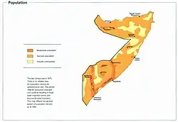 A Somália tem uma população estimada de 18 milhões de pessoas.[37] Cerca de 85% são da etnia somali. Estas estimativas são difíceis de ajustar, devido à complicada situação política do país, e também à natureza nômade muito de seus habitantes. O último recenseamento foi no ano de 1975, baseado em alguns analistas estrangeiros. A taxa de crescimento da população somali é uma das mais elevadas na África e no mundo.