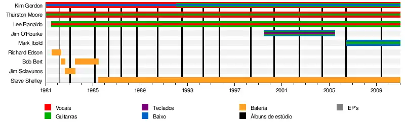 ![]() Formação final da banda antes da separação em 2011; da esquerda para a direita: Thurston Moore, Kim Gordon, Lee Ranaldo, Mark Ibold e Steve Shelley | |