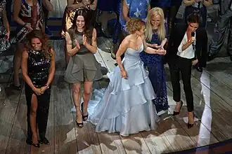 As Spice Girls se apresentando durante a sua turnê de reunião, em fevereiro de 2008. Da esquerda para a direita: Mel C, Victoria Beckham, Geri Halliwell, Mel B e Emma Bunton | |