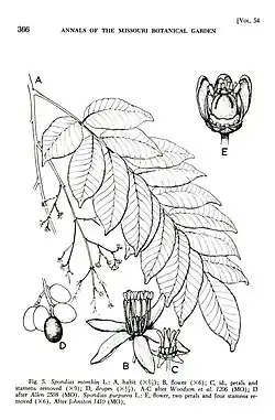 - ↑ Lozano, N. B. de (1986). Universidad Nacional de Colombia, ed. «Contribución al estudio de la anatomía floral y de la polinización del jobo (Spondias mombin L.)». Colombia: Caldasia. 15: 369-380