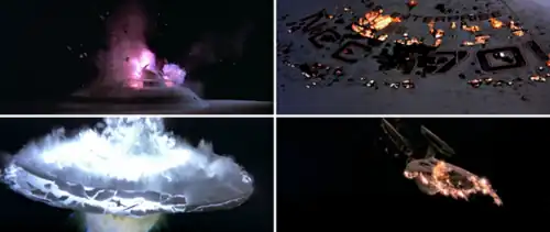 Ralston considerava a Enterprise feia e seu modelo extremamente difícil de filmar, tendo ficado encantado pela chance de destruí-la. Vários planos foram combinados para a sequência de destruição completa; apesar do supervisor ter preferido levar uma marreta para o modelo original de 150 mil dólares, miniaturas menores e mais baratas foram usadas. A primeira parte da nave a ser destruída foi a ponte de comando, que era uma miniatura separada com estrelas adicionadas ao fundo. A cena muda para a Ave de Rapina movendo-se para longe enquanto a parte superior da seção do disco queima, com várias explosões filmadas de cabeça para baixo a fim de simular a falta de gravidade[24] tendo sido sobrepostas em uma passagem de controle de movimento da nave. A câmera corta para um close do número de registro e nome da nave sendo consumidos por explosões internas. George criou um modelo de isopor que foi dissolvido por acetona gotejada no disco de cima. As gotas não ficaram visíveis na película ao manter a iluminação na miniatura e filmar o plano em menos de um quadro por segundo.[52] Lã de aço em chamas dentro do disco criaram um efeito em brasa brilhante vindo dos conveses interiores sendo destruídos.[13] A explosão do disco foi simulada ao detonar um modelo de gesso coberto de talco.[52] Bombas e gasolina foram usadas como as pirotecnias para as cenas ao vivo da ponte sendo destruída. Dublês usaram plataformas com trampolins para lançaram-se no ar.[45]