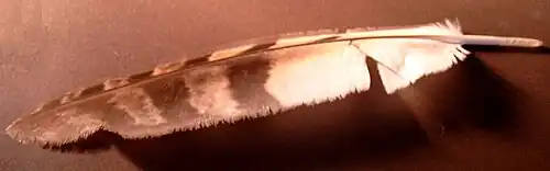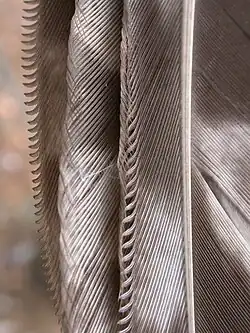 Pena de Asio otus. É possível observar a franja (ou dentadura) em forma de pente na extremidade da pena.