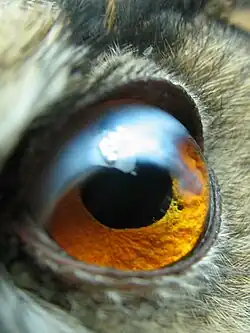 Além disso, a relação entre bastonetes e cones na retina desses animais é de muito mais bastonetes do que cones. Isto significa para as corujas uma menor possibilidade de distinção entre cores do que algumas aves diurnas, por exemplo, dado que os bastonetes têm alta sensibilidade à luz, porém fornecem poucas informações sobre cores. Apesar dessas aves serem majoritariamente conhecidas por sua visão noturna, ao contrário da percepção popular, as corujas possuem também uma boa acuidade visual em condições de alta luminosidade.[1]