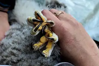 Garras da Coruja dos urais, pertencente à família Strigidae.[8] É observável as garras poderosas, eficientes em cortar tecidos comum a todas as corujas.