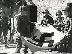 - Suástica preta, com giro de 45º, sobre disco branco - símbolo do NSDAP e bandeiras nacionais;