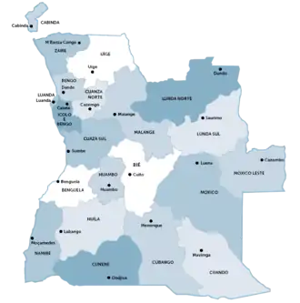 - ↑ Segundo o artigo 5.º da Constituição da República de Angola, o país não encontra-se dividido, mas sim, organizado em províncias e municípios”.