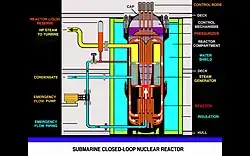 O submarino nuclear é propulsado por turbinas a vapor, que funcionam movidas com vapor produzido num gerador, aquecido por um reator nuclear. Alguns submarinos nucleares usam um motor elétrico para movimentar o hélice, com o propósito de diminuir o nível de ruído e reduzir a possibilidade de detecção.