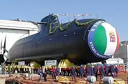Lançamento ao mar do submarino Tipo 212 Salvatore Todaro, da Marinha Militar Italiana, movido a células de combustível.[18]