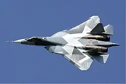 O Sukhoi Su-57 (em russo: Сухой Су-57; Designações da OTAN: Felon)[9] é um caça bimotor stealth multiúso desenvolvido pela empresa russa Sukhoi.[10] É um produto do programa PAK FA (em russo: ПАК ФА, em russo: Перспективный авиационный комплекс фронтовой авиации, transl. Perspektivnyy Aviatsionnyy Kompleks Frontovoy Aviatsii), que foi iniciado em 1999 como uma alternativa mais moderna e acessível ao projeto MFI (Mikoyan 1.44/1.42). A designação interna da Sukhoi para a aeronave é T-50. O Su-57 é a primeira aeronave no serviço militar russo projetada com tecnologia furtiva e destina-se a ser a base para uma família de aeronaves de combate furtivas.