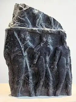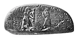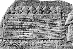 Retrato de um prisioneiro sumério em uma estela de vitória de Sargão da Acádia, c.2300 a.C. [23] O penteado dos prisioneiros (cabelo encaracolado no topo e curto nas laterais) é característico dos sumérios, como também se vê no Estandarte de Ur.[24] Museu do Louvre