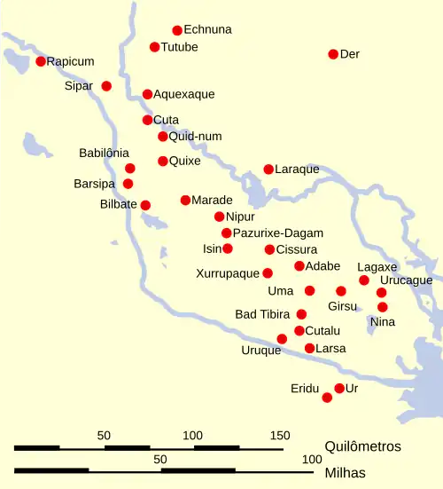 Principais cidades Ur, Nipur, Eridu, Lagas, Uruque, Guirsu, Churupaque, Adabe, Uma, Zabalam