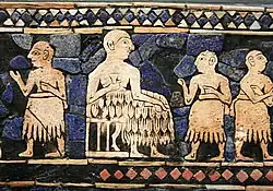 Rei sumério entronizado de Ur, possivelmente Ur-Pabilsag, com seus acompanhantes. Estandarte de Ur, c. 2600 a.C