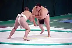 Sumô (português brasileiro) ou Sumo (português europeu) sumō (相撲) é um desporto de luta competitiva de contato no qual um rikishi (lutador) tenta forçar outro lutador para fora de um ringue circular (dohyō) ou tocar o solo com qualquer parte do corpo que não as solas dos pés. O esporte originou-se no Japão, o único país no qual ele é praticado profissionalmente.[1] Qualquer competição realizada fora desse país é considerada uma competição de sumô amador. Os praticantes do sumô profissional tem status semidivino no Japão e podem ganhar valores que, convertidos, podem chegar a até R$ 100 mil mensais como remuneração. Já no sumô amador, parte dos elementos religiosos sai de cena, e os lutadores podem usar vestimentas maiores, além de os soldos serem muito menores.[1]
