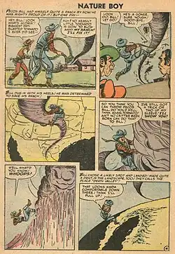 Pecos Bill, criado por Tex O'Reilly em 1923, também incorporava qualidades proto-super-heróicas. Criado por coiotes após se perder na infância,[38] Bill se tornou um cowboy grandioso, capaz de domar tornados, cavalgar feras selvagens e realizar feitos impossíveis através da fronteira.