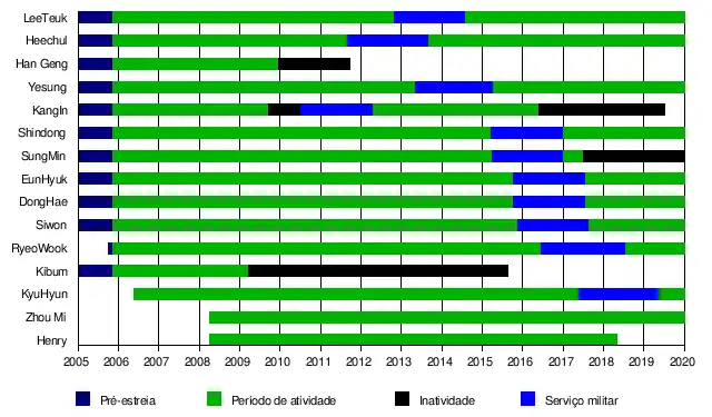 Todos os membros completaram o serviço militar obrigatório durante o período de setembro de 2011 a maio de 2019. Heechul alistou-se em 1 de setembro de 2011, completando seu serviço militar em 30 de agosto de 2013.[194] LeeTeuk alistou-se para o serviço militar obrigatório em 30 de outubro de 2012, e o terminou em 29 de julho de 2014.[123] Yesung alistou-se para o serviço militar obrigatório em 6 de maio de 2013, completando-o em 4 de maio de 2015.[195] Shindong planejava alistar-se para o serviço militar obrigatório em 25 de novembro de 2014,[196] mas adiou seu alistamento devido a um problema de saúde.[197] Shindong alistou-se para o serviço militar obrigatório em 24 de março de 2015, completando-o em 23 de dezembro de 2016.[198][199] Sungmin alistou-se para o serviço militar obrigatório em 31 de março de 2015, completando-o em 30 de dezembro de 2016.[200] EunHyuk alistou-se para o serviço militar obrigatório em 13 de outubro de 2015,[201] completando-o em 12 de julho de 2017.[202] DongHae alistou-se para o serviço militar obrigatório em 15 de outubro de 2015,[203] completando-o em 14 de julho de 2017.[202] Siwon alistou-se para o serviço militar obrigatório em 19 de novembro de 2015, completando-o em 18 de agosto de 2017.[204] Ryeowook alistou-se para o serviço militar obrigatório em 11 de outubro de 2016.[205] Kyuhyun alistou-se para o serviço militar obrigatório em 25 de maio de 2017.[206]