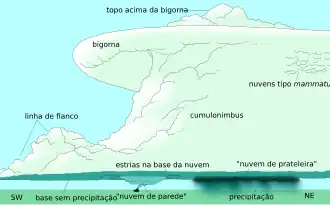 Bigorna: uma "bigorna" se forma quando os ventos ascendentes da tempestade colidem com o topo da troposfera e não têm mais como subir por causa das leis de fluidodinâmica - especialmente, pressão, umidade e densidade. A bigorna é muito fria e virtualmente sem precipitação apesar da precipitação do tipo virga (quando a precipitação evapora antes de atingir o solo) acontecer depois da tempestade. Uma vez que existe muito pouca umidade na bigorna, os ventos podem se mover livremente. As nuvens tomam a forma de bigorna quando o ar ascendente atinge de 15 mil a 21 mil metros ou mais. A forma de bigorna é mais facilmente distinguível na frente da tempestade, como uma concha. Em alguns casos, se essa forma continuar depois da tempestade, é um sinal que um vento ascendente ainda persiste.[15]