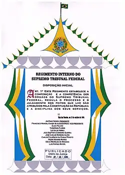 O Regimento Interno do Supremo Tribunal Federal do Brasil (RISTF) é o documento oficial que rege, com égide na Constituição, os trâmites e o funcionamento administrativo da corte maior do poder judiciário do Brasil.[63]