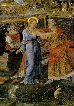 A história conta que uma bela esposa judia chamada Susana é acusada falsamente por libidinosos observadores escondidos (voyeur). Enquanto ela se banha no jardim e tendo mandado embora suas damas de companhia, dois dos anciãos secretamente observam a adorável Susana. Quando ela está voltando pra casa, eles a pressionam e ameaçam alegar que ela estaria se encontrando com um jovem no jardim caso ela não concorde em entregar-se a eles.