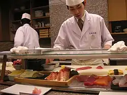 No Japão, e cada vez mais no exterior, o sushi é servido na forma conhecida como kaiten zushi, um estilo de fast-food japonês no qual os pratos são dispostos em balcões giratórios pelo qual os pratos passam e onde as pessoas podem se servir. Nesse sistema, os preços são definidos pela cor dos pratos no qual os alimentos estão. No final da refeição o atendente calcula o valor da conta pelo número de pratos sobre a mesa do cliente e suas cores. Restaurantes mais modernos colocam chipes de RFID nos pratos para se calcular automaticamente a conta.