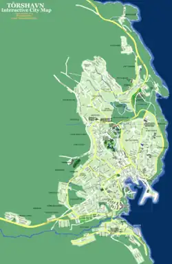 Mapa da área urbana de Tórshavn, com destaque para suas estradas (em amarelo).