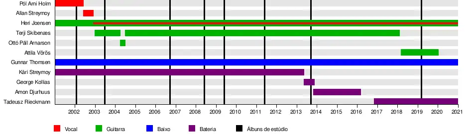 Com o passar dos anos, diversos diversos músicos passaram pela banda. O vocalista Pól Arni Holm e o guitarrista Jón Joensen (irmão de Heri Joensen) foram parte da formação original da banda, gravaram How Far to Asgaard, mas abandonaram o grupo pouco depois do lançamento do álbum em 2002.