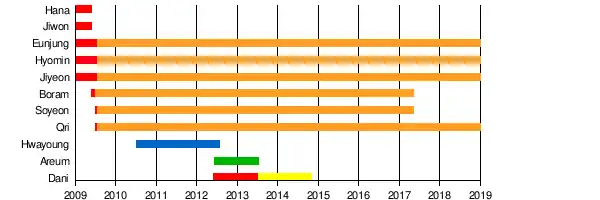 - Jiwon (hangul: 지원), nascida Yang Jiwon (hangul: 양지원) em 5 de abril de 1988 (38 anos) em Seul, Coreia do Sul.