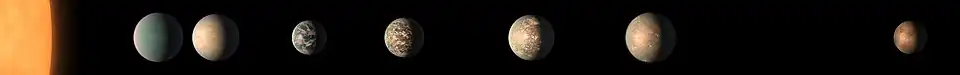 A TRAPPIST-1 é orbitada por sete planetas, designados TRAPPIST-1b, 1c, 1d, 1e, 1f, 1g, 1h[36] e, ordem alfabética por distância crescente da estrela.[37] Esses planetas têm período orbital entre 1,5 e 19 dias,[38][38][39] em distâncias de 0,011 a 0,059 unidades astronômicas (1 700 000 - 8 900 000 km).[40]