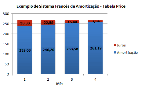 Um mês depois do empréstimo, o saldo devedor cresce 3% indo para $ 1 030,00, porém, como também deve ocorrer o pagamento de $ 269,03, o saldo devedor passa a ser $ 760,97. Perceba que o pagamento da parcela cobriu os juros de $ 30,00 e também fez a amortização de $ 239,03 (1 000,00 - 760,97) do valor emprestado. O mesmo ocorre nos meses seguintes, porém, como o saldo devedor diminui a cada mês, o valor das parcelas relativo ao pagamento dos juros é decrescente.