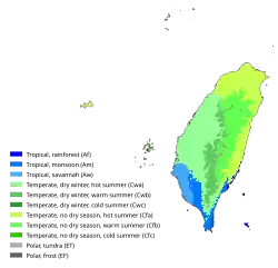 Taiwan fica no Trópico de Câncer e seu clima geral é tropical marinho.[45] As regiões norte e central são subtropicais, enquanto o sul é tropical e as regiões montanhosas são temperadas.[46]
