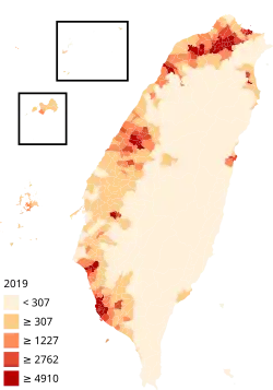A população de Taiwan é estimada em cerca de 23,5 milhões de pessoas,[51] sendo que a maioria mora na ilha principal do país. O restante vive nas Ilhas Pescadores (100 400), Kinmen (120 713) e as ilhas Matsu (12 165).[52]