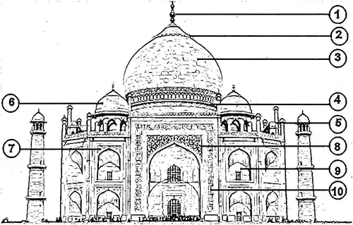 O conjunto do Taj Mahal, com a sua fachada principal perpendicular a uma ribeira do Yamuna, foi construído com os seguintes elementos arquitectónicos: