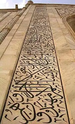 A letras estão incrustadas com quartzo opaco sobre os painéis de mármore branco. Alguns dos trabalhos são extremamente detalhados e delicados, especialmente os que se encontram no mármore dos cenotáfios da tumba. Os painéis superiores estão escritos com caligrafia proporcionada para compensar a distorção visual ao observá-los desde baixo.[carece de fontes]