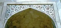 As parede baixas do templo funerário mostram frisos de mármore com baixos-relevos de flores e vegetais que foram polidos para ressaltar o extremo requinte do trabalho. Os frisos e as arcadas foram decorados com incrustações de pedras semipreciosas formando desenhos muito estilizados de flores, frutos e outros vegetais. As pedras incrustadas são mármore amarelo, jade, quartzo polido e outras gemas menores.[carece de fontes]