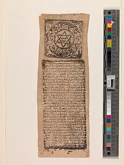 Esse objeto, um Pergaminho Talismânico, datado do século XI, foi descoberto no Egito e produzido no Califado Fatímida (909-1171 CE). Ele reside na coleção do Metropolitan Museum of Art (Nova Iorque)[9] juntamente com vários outros amuletos e talismãs islâmicos medievais que foram doados ao museu pela família Abemayor em 1978. Aproximadamente nove por três polegadas de tamanho, o rolo de papel em miniatura contém uma combinação de orações e versículos do Alcorão e foi criado para ser colocado em uma caixa de amuleto. Esta gravura em bloco traz o cúfico, a mais antiga caligrafia árabe, bem como o Selo de Salomão, uma estrela com seis pontos que foi identificada em um grande número de obras de arte islâmicas do período.[10]