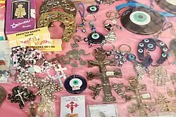 Diversos tipos de talismãs numa vitrine de uma loja de apetrechos religiosos no Porto, Portugal.