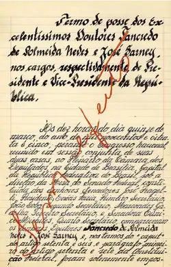 "Ele (Sarney) assumiu a presidência, sozinho. Todos os ministros de João Figueiredo estavam exonerados. Por sugestão do Dr. Leitão de Abreu, o general Figueiredo não passou a faixa para Sarney. O próprio dr. Leitão contou-me essa história. Consultado sobre a cerimônia ele sugeriu ao presidente Figueiredo que não passasse a faixa porque Sarney entraria no exercício do cargo como substituto e não como sucessor. Tancredo Neves estava vivo. Eventualmente sem condições de assumir a presidência da República, mas vivo. Foi uma decisão consciente e correta. Tancredo só morreria em abril. Então, fica claro que o general João Figueiredo não se negou a entregar a faixa por birra - como disseram - e sim, por determinação constitucional. A faixa presidencial é o símbolo do poder, mas não completa a investidura".
