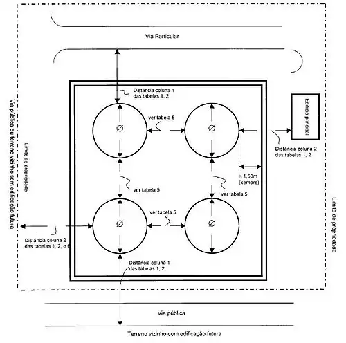 | Capacidade do tanque m³ | Distância mínima do limite da propriedade onde haja ou possa haver construção, incluindo o lado oposto da via pública (m) | Distância mínima do lado mais próximo de qualquer via pública ou qualquer edificação importante na mesma propriedade (m) |