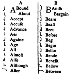 Consiste em atribuir um taquigrama para cada som vogal, consonantal ou par de fonemas homorgânicos (P, B - Q, G - T, D - F, V - S, C - X, G), diferente do português que utiliza um conjunto de letras para representar um som. Existem dez taquigramas que representam o som das consoantes, os seis fonemas homorgânicos já apresentados e as consoantes: L, M, N e R. E seis vogais (a vogal E é separada entre aguda e grave)