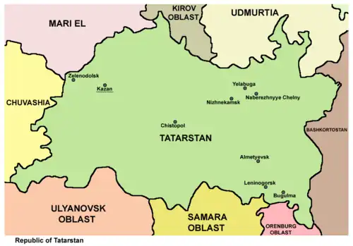 As principais cidades do Tartaristão são Cazã, com 1 110 000 habitantes, Naberezhnyye Tchelny (anteriormente denominada Brejnev, no período soviético), com 507 000 habitantes, Nijnekamsk, com 227 000 habitantes, e Almetievsk, com Predefinição:Fmgn. Outras cidades importantes são Bugulma, Buinsk, Tchistopol, Kukmor, Leninogorsk e Zelenodolsk.