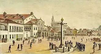 Vista do Teatro Real de São João, atual João Caetano, no Rio de Janeiro, um dos mais importantes teatros do Brasil. Pintura de Jean Baptiste Debret (1834).