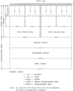 O termo teatro de operações era definido nos manuais de campo americanos como as áreas terrestres e marítimas a serem invadidas ou defendidas, incluindo as áreas necessárias às atividades administrativas incidentes às operações militares (quadro 1). De acordo com a experiência da Primeira Guerra Mundial, geralmente era concebida como uma grande massa de terra sobre a qual ocorriam operações contínuas e foi dividida em duas áreas principais: (1) a zona de combate, ou a área de combate ativo, e (2) a zona de comunicações, ou área necessária para administração do teatro. À medida que os exércitos avançavam, essas zonas e as áreas em que foram divididos mudariam para novas áreas geográficas de controle.[6]